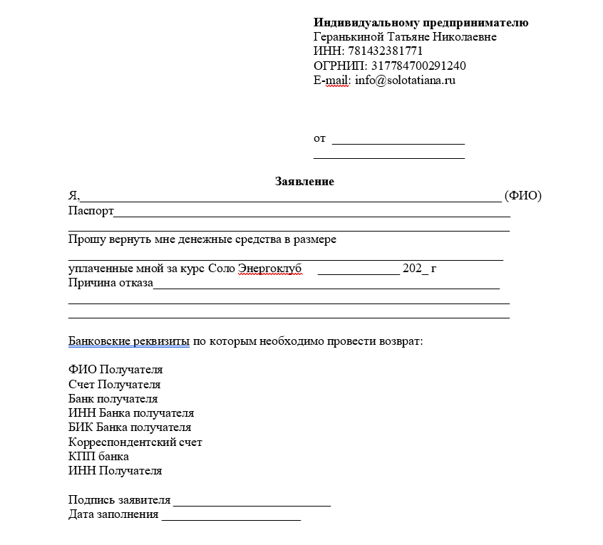 Индивидуальный предприниматель Геранькина Татьяна Николаевна ИНН 781432381771 ОГРНИП 317784700291240, именуемый в дальнейшем «Исполнитель», настоящим предлагает заключить договор оказания образовательных услуг по обучению в онлайн-курсе «Соло энергоклуб», предусмотренном на сайте https://